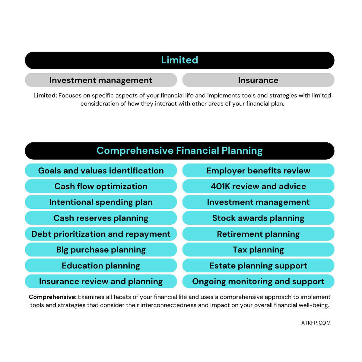 Comprehensive financial planning is an ongoing process. Frequently reviewed to ensure the right progress is being made. It remains flexible to capture changes as your life evolves. You are always aware of your financial well-being, and you know what next step you need to take towards your prosperous financial future. It answers the important question, “Am I going to be OK financially?”.